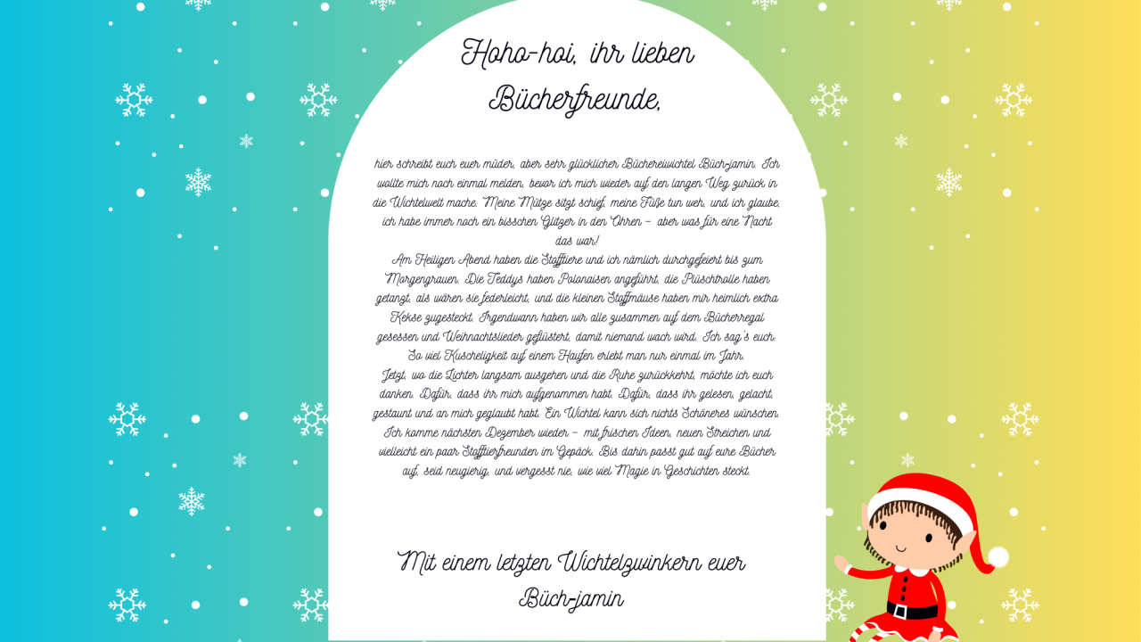Bücherei Roitham Dezember, 2025 Büch-jamin verabschiedet sich Nach einer rauschenden Weihnachtsnacht verabschiedet sich der Büchereiwichtel Büch-jamin mit einem Brief. Er hat mit sämtlichen Stofftieren in der Bücherei gefeiert und gelesen.