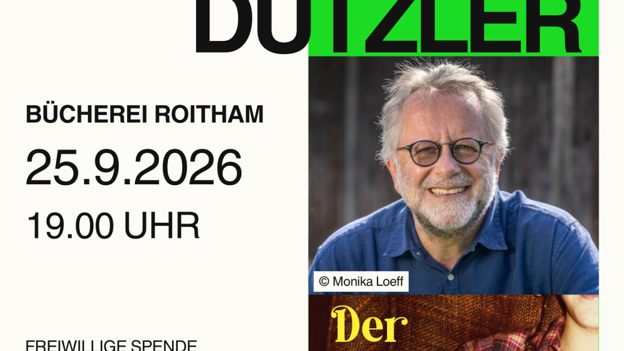 Bücherei Roitham 25.09.2026 Lesung Herbert Dutzler Lesung mit Herbert Dutzler um 19.00 Uhr in der BüchereiFreiwillige SpendenFür Verpflegung ist gesorgt!