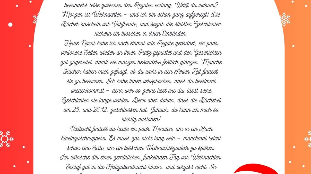 Bücherei Roitham Dezember, 2025 Wieder ein Brief vom Büchereiwichtel Büch-jamin freut sich schon auf Weihnachten. Er hat euch Wichtel-Lesezeichen in der Bücherei hinterlegt.